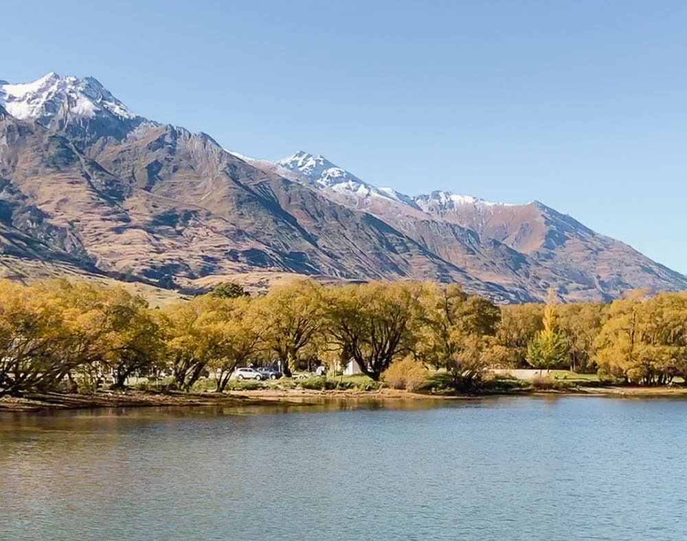 Lake Hayes surrounded by mountains blanketed in golden tones and fall colors.
