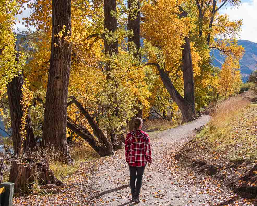 Arrow River Trail in Arrowtown surrounded by trees covered in yellow and golden tones of fall.